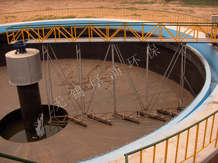 原水從池底經中心支墩上不流出,並經穩流筒配水後,呈輻射狀流向池子周邊集水槽出水,隨著輻向流速的降低,原水中的懸浮物被分離而沉降於池底。工作橋以中心支座為圓心,帶動刮泥、排渣機構,在驅動裝置驅動下將汙泥刮集至沉澱池中心集泥槽,依靠水壓或泵排出池外,上部浮渣由刮渣板同步刮至排渣鬥排出。