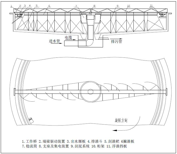 中心支座由固定支撐座、回轉軸承和橋架組成,可同時承受軸向力、徑向力和傾覆力矩。集電裝置采用滑環式集電裝置,由集電環和電刷架組成。浮渣刮板、浮渣耙板、浮渣漏鬥組成排渣機構,能有效地清除水麵浮渣。工作橋是連接中心支座和行走端梁的大型部件,其上有走道板和欄杆,鋼梁的下麵連接刮泥結構、排渣機構等,在行走裝置的帶動下來完成刮泥、排渣工作。