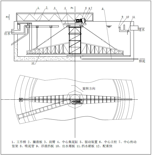 該設備采用中心傳動、垂架式,汙水進入周邊配水槽內,經槽底配水孔均勻流入池內,並在周邊擋水裙板的作用下,水流從池底流向中心,汙泥依靠自重沉積於池底,從而形成泥水分離,驅動裝置驅動中心豎架旋轉,並帶動刮臂及吸泥管旋轉,在靜水壓力的作用下,汙泥均勻地進入吸管上布置的吸口,然後通過中心排泥井的套筒閥排出池外。排泥量的大小可由套筒閥的升降度來控製,水麵的浮渣通過撇清裝置撇向池邊,再由刮渣耙刮進排渣鬥內排出池外。